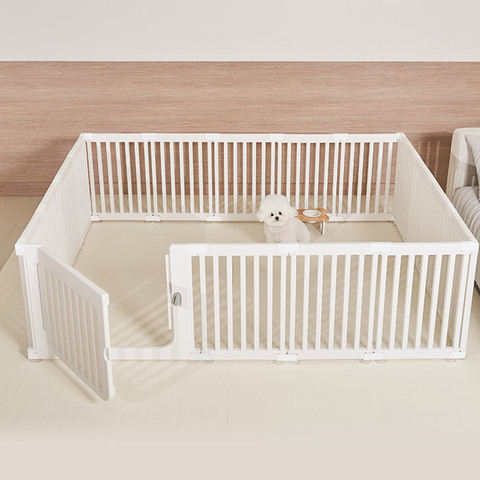 ■小型犬も安心!柵の隙間が3.5cmのシンプルで使いやすいペットサークル<br> 柵の隙間が3.5cmと従来品に比べ狭くなっているため、小型犬やパピーなどの小さいワンちゃんでもすり抜けられず安心してお使いいただけます。<br> ホワイトとライトグレーどちらも明るいお色味でどんなお部屋とも相性抜群です。<br><br> ■圧迫感のない絶妙な高さ<br> サークルの高さ60cmとワンちゃんが飛び出しにくく圧迫感も感じにくい設計です。<br><br> ■ドア付きで出入りラクラク<br> ドア付きなので出入りも楽々。扉の外にロックが付いており、内側からは開けられない設計です。<br><br> ■安心素材<br> 木製や鉄製と違い、材質が高密度ポリエチレンのため錆びることもありません。<br> ホルムアルデヒドも未検出で安心です。<br><br> ■吸盤付きの固定ホルダ―<br> 固定ホルダーに吸盤がついているので、フローリングのようにデコボコのない床でしたら固定が可能です。<br><br> ■別売パネルで拡張や仕切りが可能<br> パネルや固定ホルダーを追加することでより広く拡張していただいたり、サークル内を仕切ることができます。<br> 遊び場とトイレを分けるなどスタイルに合わせてアレンジしてください。<br><br> ■組み立て簡単<br> 付属のパーツをはめるだけなので別途ドライバーなどをご用意いただく必要がございません。<br> お一人でも簡単に組み立てが可能です。