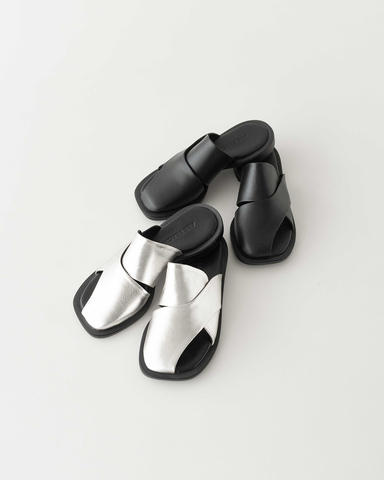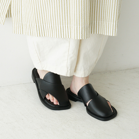 上質なレザーとシンプルなフォルムが魅力のフラットサンダル。
