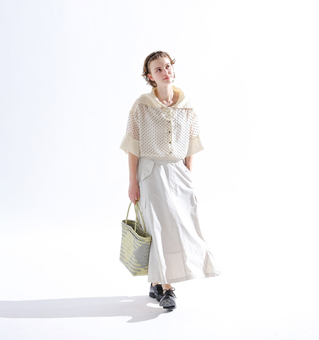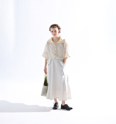 シアー感のあるドット素材を身頃に使用し、衿と袖口には無地のシアー素材を合わせて落ち着いたデザインに。