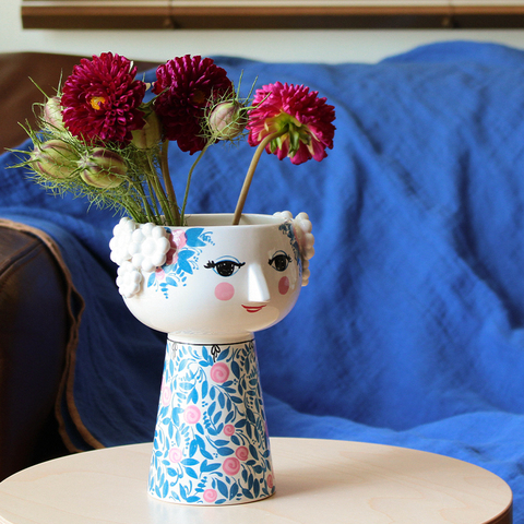 彼女の優しい笑顔、アーモンド形の瞳と尖った鼻、手描き風の幾何学模様と色彩をミックスしたドレスがカラフルで可愛らしいフラワーベースです。