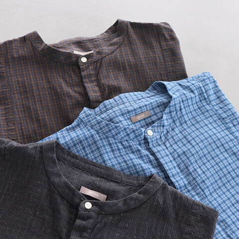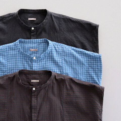 カラーによって異なる素材を使用した表情豊かなチェック生地をパッチワークで縫い合わせたデザイン性の高い一着。Blue CheckとNavy Checkはドライタッチな質感のコットン生地を採用。軽やかな肌離れが良い生地は蒸し暑い季節でもさらっと涼やかにご着用いただけます。Black Checkはナチュラルな風合いが魅力のコットンとリネンの混紡生地。柔らかさがありながらもリネン独特のシャリ感を感じられる仕上がりになっています。