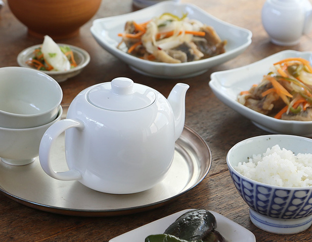 白地のシンプルな風合いは和食器にも合わせやすく、普段使いもしやすい佇まい。食後のゆったりした時間をお茶を飲みながら過ごせます。