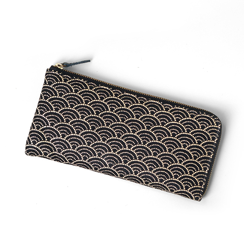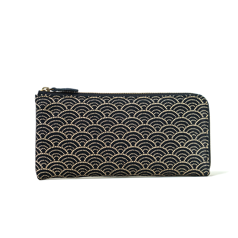 柔らかな鹿革の風合いに漆の文様が美しい長財布。L字型にファスナーが付いており紙幣の出し入れがスムーズで、十分な容量が入るのにスマートなサイズ感なので、その使い心地から人気のあるデザインです。