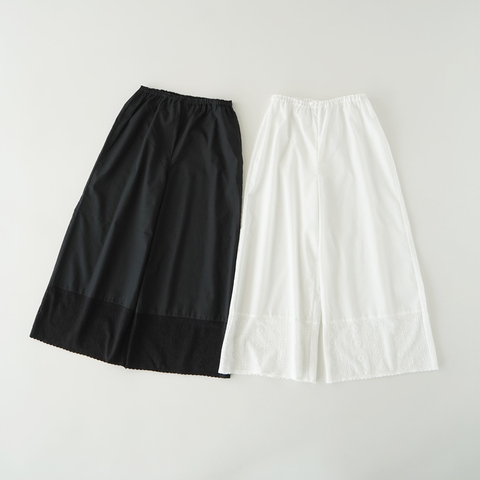 ワイドなシルエットがスカートのようにも見え、レイヤードスタイルを上品に格上げ。見た目の華やかさも魅力ながら肌離れの良いコットンミックス素材で着心地も快適。