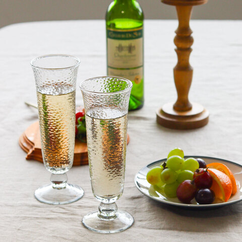 凹凸のある表面が光をやさしく散らし、繊細な表情を映し出すガラスのフルートグラス。