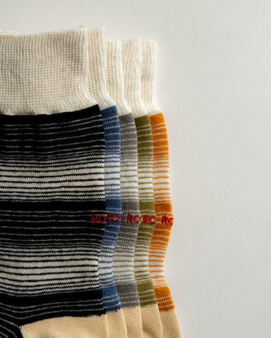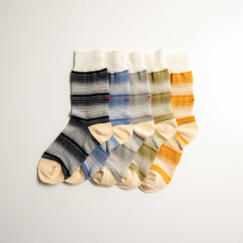90年代のカジュアルなボーダーTシャツを思わせるストライプ柄を落とし込んだクルーソックスは、日常のコーディネートに遊び心を添えるアイテムです。
