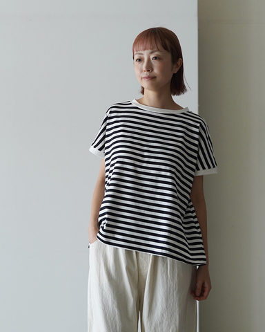 クリーンなボーダーが映えるトップスは、余白を活かしたミニマルな佇まいが魅力。