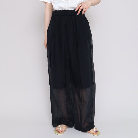 ウエストゴムのイージーパンツはテーパードシルエットで広がりすぎないデザイン。