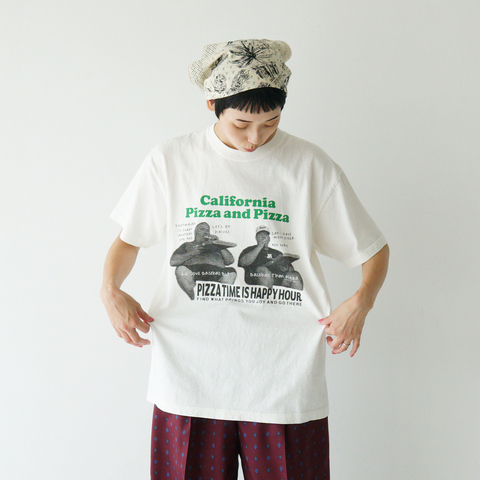 ピザやポップコーンを美味しそうに抱えたり頬張っている様子を大胆にプリントしたデザインが、視線を集めるユニークなTシャツです。