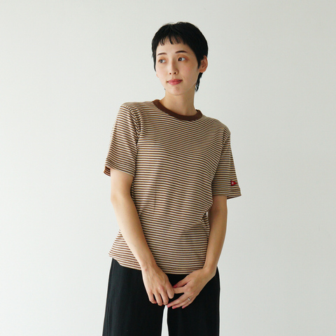 ブラウンの配色リブがアクセントになったボーダーTシャツは、どこか懐かしさを感じさせるデザイン。コンパクトすぎないサイズ感で、ラフに着てもだらしなく見えず、大人のカジュアルにぴったりです。