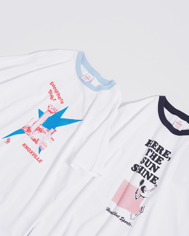 レトロなムード漂うプリントが印象的な、リンガーTシャツ。