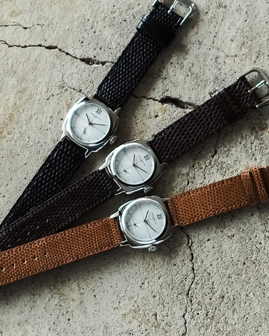 そのベルトを、1920年代の時計を再現した"COUSSIN(クッション)"を50、60年代のミッドセンチュリー期のドレスウォッチを感じさせるモダンな時計にリデザインした"COUSSIN Sophie(クッションソフィ)"に組み合わせることで、品格と高級感が漂う仕上がりに。