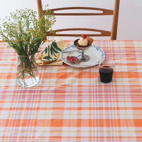 このテーブルクロスは、カラフルなチェック柄の上に、刺繍モチーフやブロックプリントを重ね合わせた、ミックスマッチのデザインが魅力。どこか懐かしく、それでいて新鮮な表情が生まれています。