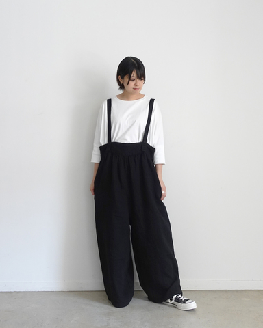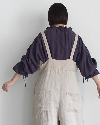 リネンならではの洗いざらしの凹凸と落ち感からのシルエットが映えたリネンサロペット。