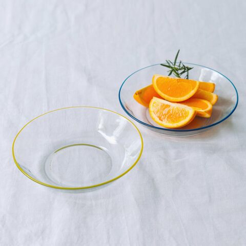 ガラスの透明感に、イエローとブルーの縁取りでカラーアクセントをプラスした、bitte(ビッテ)シリーズ。フレッシュな印象で、盛り付けたものをより美味しそうに見せてくれます。
