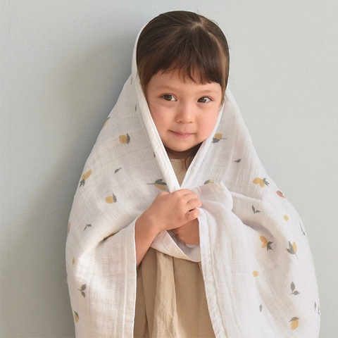 ベビーのお肌にも優しい、ふんわり4重ガーゼ素材を使用。パイルタオルに比べてコンパクトに畳めるので、お風呂上りはもちろんのこと、ベビーカーや車中でのひざ掛け代わりに持ち運ぶのにもぴったりです。