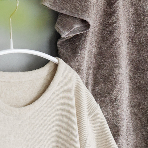 パイル素材とリブ素材を同時に編み立てているのも大きな特徴。生地を二枚合わせにしていないので、ゴワゴワせず、軽やかな着心地で夏にもぴったりです。