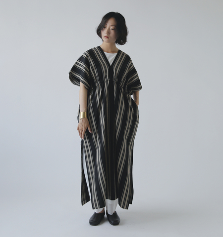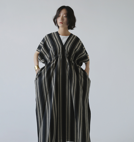 コットンリネンのストライプ生地で作られた定番ワンピースです。抜け感のあるシルエットや生地のドレープ感など、雰囲気あるルックスが魅力的な1枚。存在感あるワンピースですので1枚でサマになる特別感のあるお洋服です。