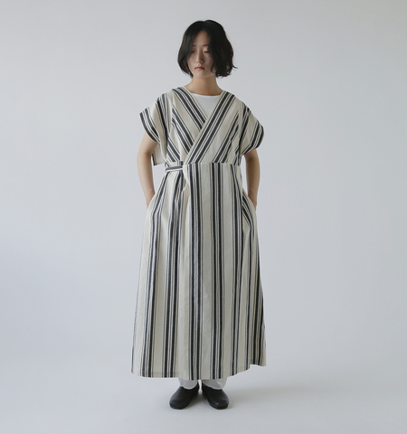 腰紐を左脇に回して、羽織るような感覚で着られます。共布で作られた紐が一体となっており、こちらでウエスト周りの調整ができるので、お好きなシルエットで着ることができます。