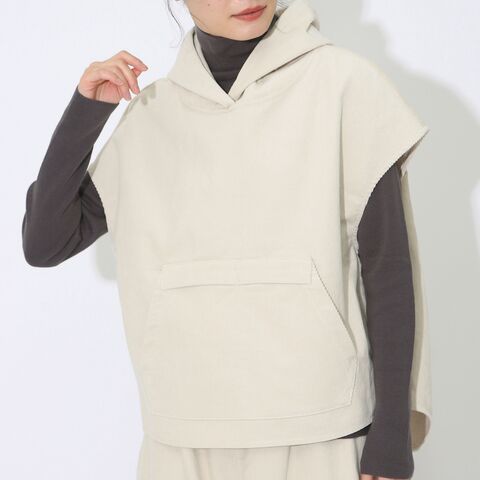 コットンのコーデュロイ素材を使用した、表情豊かなフード付きプルオーバーベスト。
