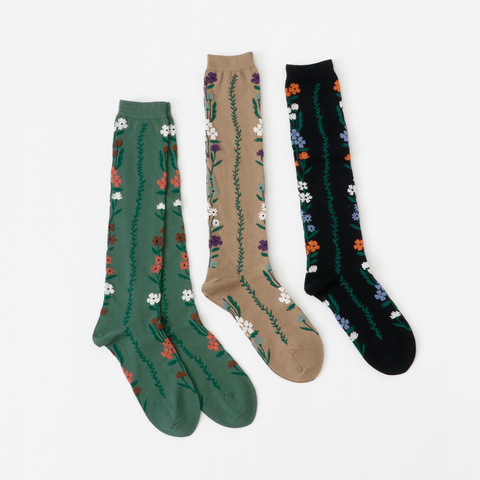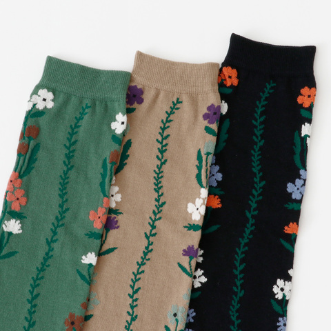 花の連なりで幸せの連鎖を表現した柄のハイソックス。