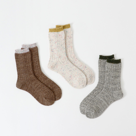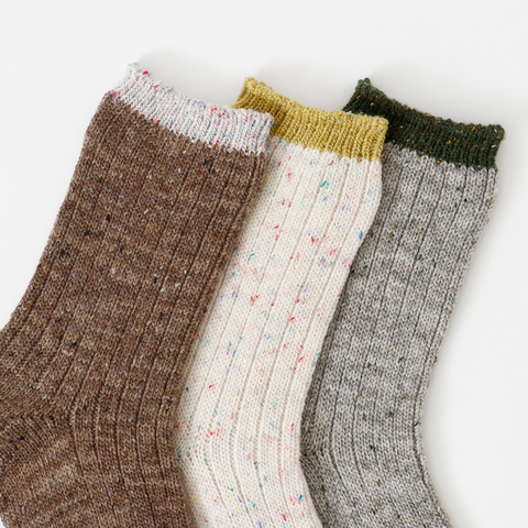 カラーネップ糸と防縮ウール糸をMIXして編み立てた、素材感が活きたソックスです。