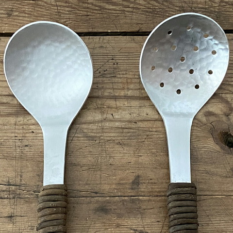 鍋料理などの取り分け用にオススメ、軽くて使いやすいアルミ製の おたま と 穴あきタイプのおたま。