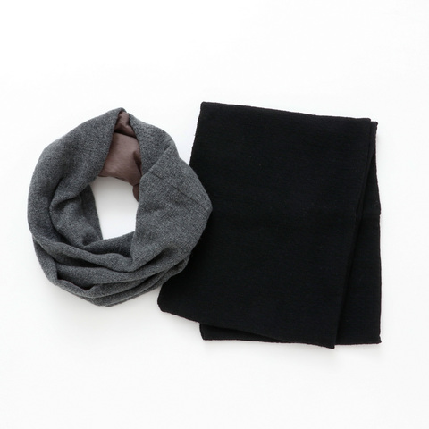 エアリーウール混の梨地生地と薄いコットンニット生地を合わせたスヌードです。