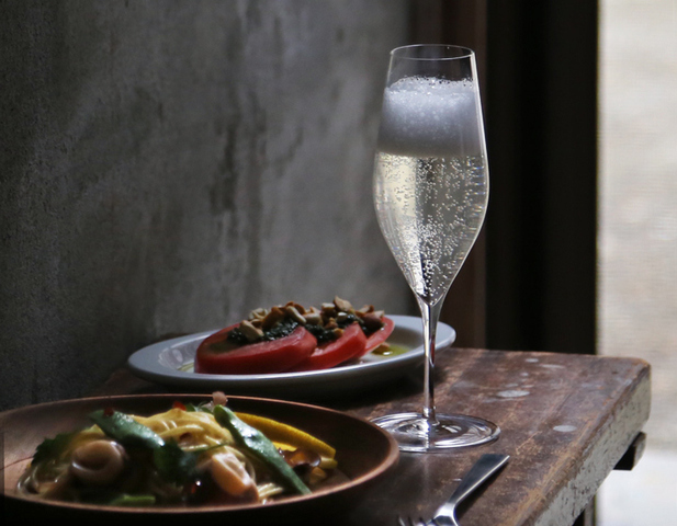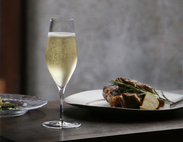 底がV字型になっていて泡立ちが良く、スパークリングワインを注ぐときれいな気泡が立ち上ります。エッジの効いた極薄の飲み口は口当たりも抜群で、スーッと口の中へと滑り込んできます。