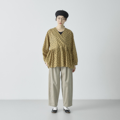 薄くしなやかで微かなシアー感がある、ドット柄のコットンローン生地を使用したカシュクールブラウスです。