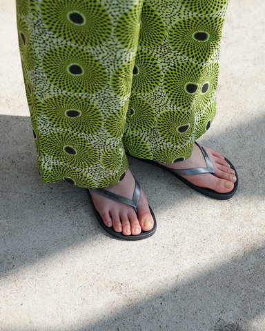 コーデをまとめるのは、ブラックのバッグとフラットなトングサンダル。軽さと引き締め感のバランスが絶妙で、スタイリング全体を大人っぽく仕上げています。