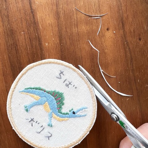「12の恐竜と古代生物の刺繍キット」からスピノサウルスと「おなまえ刺繍キット」を『まるワッペン』に刺繍