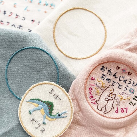「hugするいきもの刺繍キット」と「おなまえ刺繍キット」の図案を組み合わせて使用