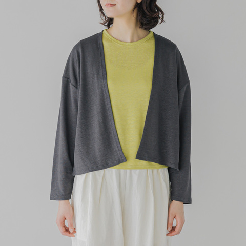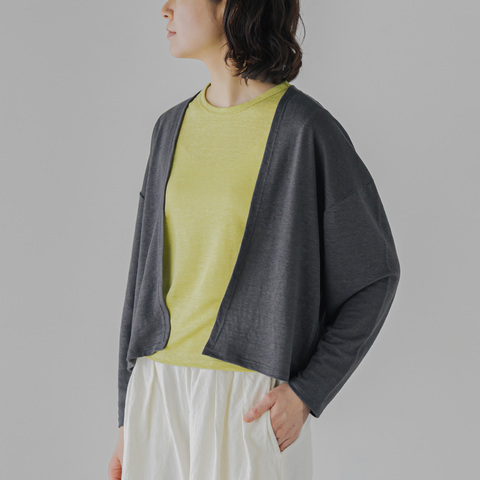 リネンを贅沢に100%使用したニットカーディガン。ボタンレスでさっと羽織りやすく、おうちでも外でも気負わず着られて、きちんと見える。そんなちょうどいいバランスが魅力です。