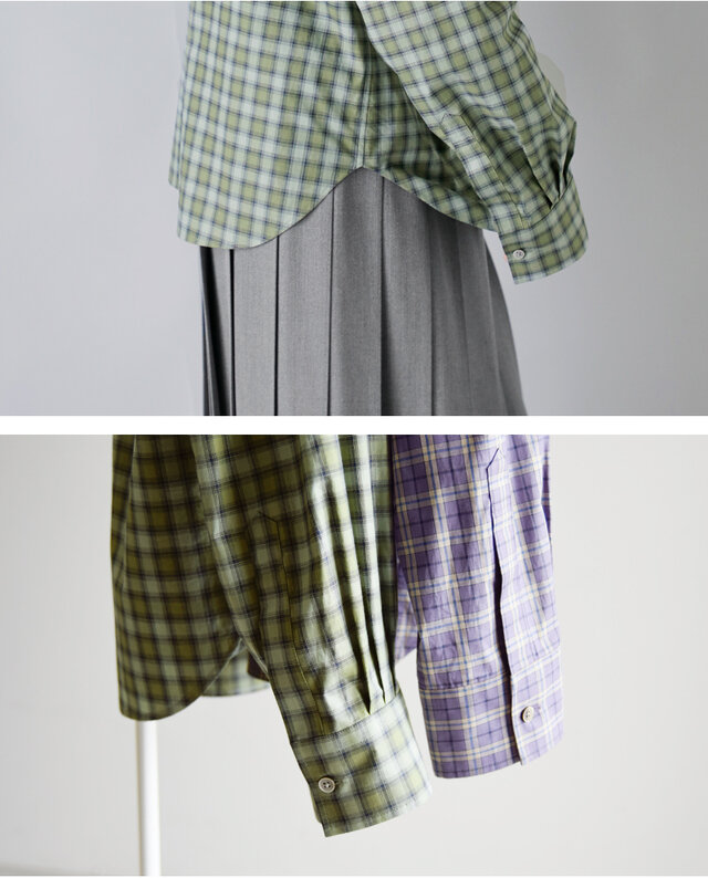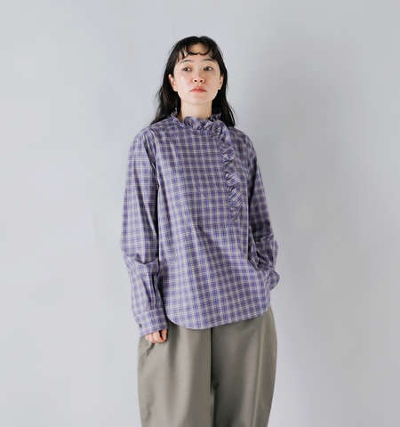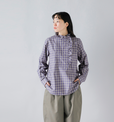 トルコの生地メーカーSOKTUS社の、オーガニックコットン素材を使用。シックなカラーで組み合わされた、トラッドなミニチェック柄とフリルのミックス感が魅力のフリルシャツです。襟元は釦を留めても、開けて折り返したスタイルも両方楽しめるので、様々なスタイリングでお楽しみください。