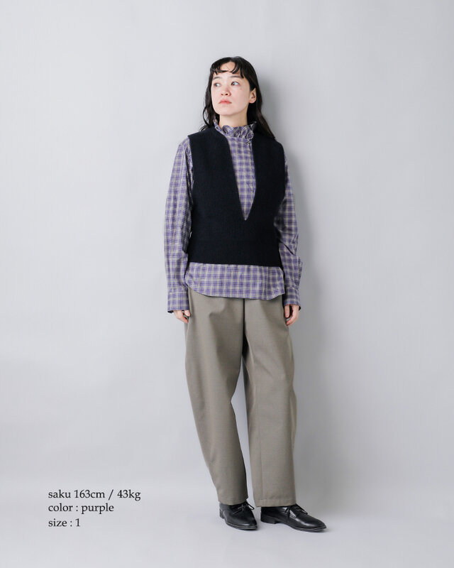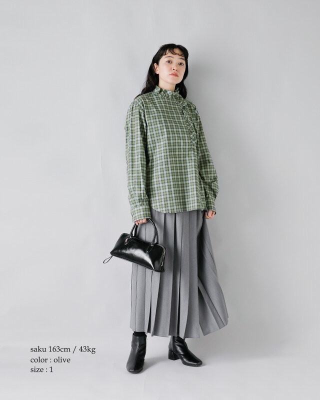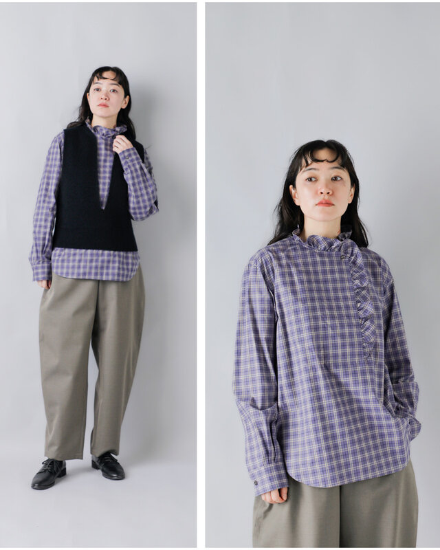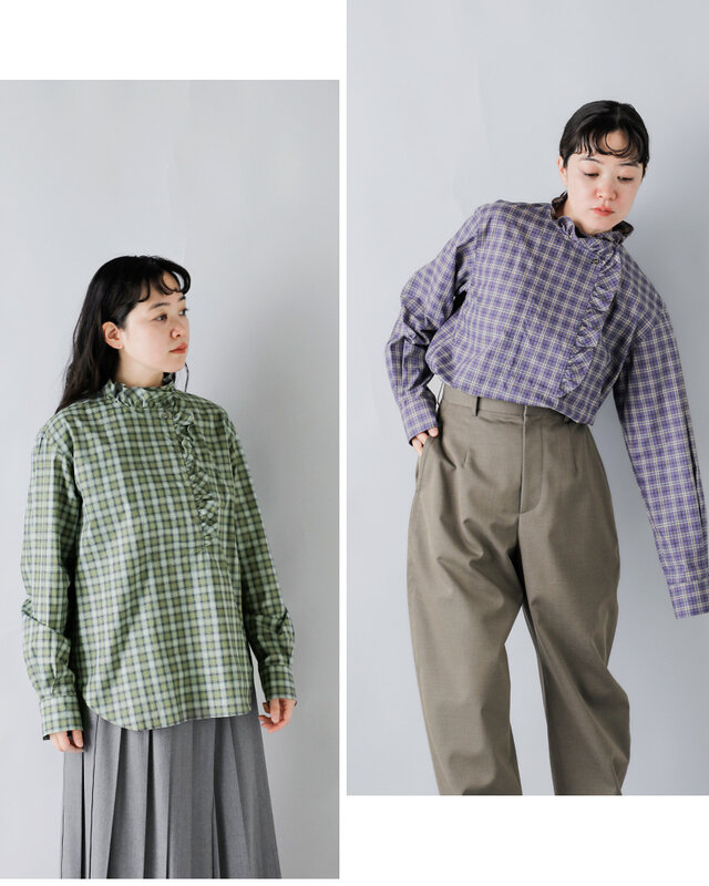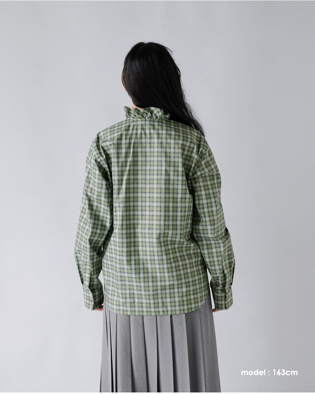 首元に立ち上がるようなスタンドカラーをベースに、全体に繊細なフリルが施されています。柔らかなチェック柄と相まって、上品で女性らしい印象に。