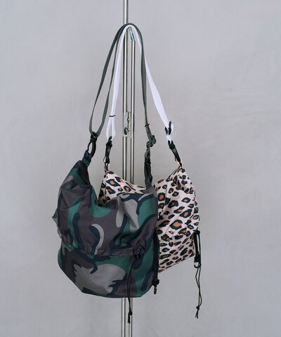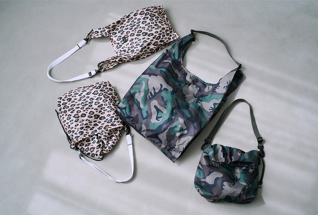 「WOODLAND CAMO×DARK GREY」と「LEOPARD×WHITE」の2柄を、3つのアイテムで展開します。