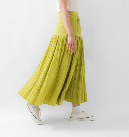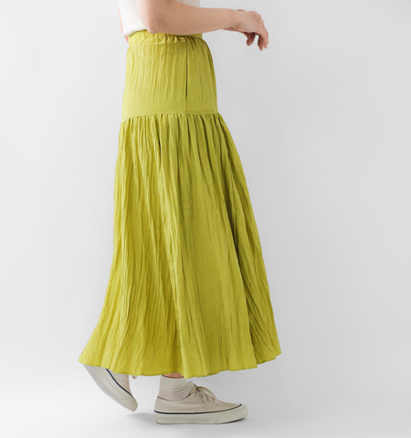 夏にピッタリな軽い素材のスカート。少しワッシャーのかかった素材にさらにプリーツをかけた贅沢なスカートです。ポリエステル素材で非常に軽く、裾はボリュームがあっても重くならないのがポイントです。