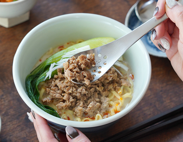 すくい部に穴が空いているので、食材の汁気を切ってすくえます。沈んで諦めがちな、担々麺や味噌ラーメンの細かな具材も、最後まで美味しく食べられます。