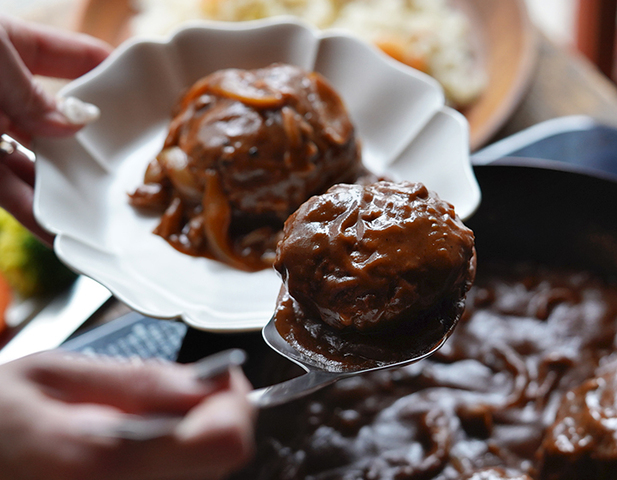 底が平なので料理の形を崩すことなくすくうことができます。ハンバーグはソースごとすくうことができ、調理から盛付けまで活躍します。