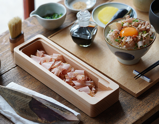 卵かけごはんや冷奴、お浸しやサラダ、お好み焼きなど粉もののトッピングに。食事をしながら鰹節を削るという新しいライフスタイルを提案する台屋の鰹節削り器は、食卓に置いても違和感のないデザイン。従来の引き出しをなくすことで、高さは半分ほどに。背が低いので上から押さえて力がいれやすく、キッチンで使うのはもちろん、座って食卓で削りたての風味豊かな鰹節を味わうことができます。
