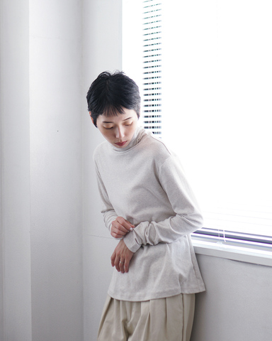 くしゅっと寄った首元がポイントとなり、秋冬の重ね着スタイルに絶妙な奥行きを与えます。袖はすっきりとしたラインでジャケットやカーディガンのインナーにも最適。