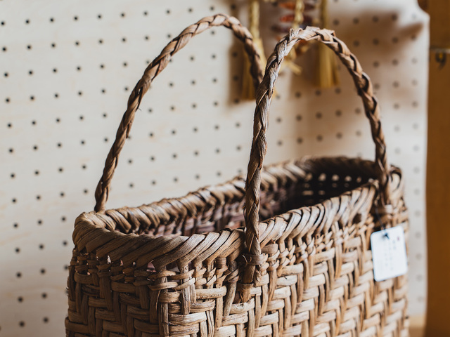 黄金屋の山葡萄のかごバッグです。山葡萄はほかの草木の蔓(ツル)と比べて耐久性が高く強度に優れているため、ロープや吊り橋の素材としても使用されています。そんな山葡萄の蔓から取れる樹皮で作った籠は、とても頑丈なのが特徴です。