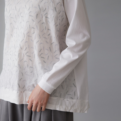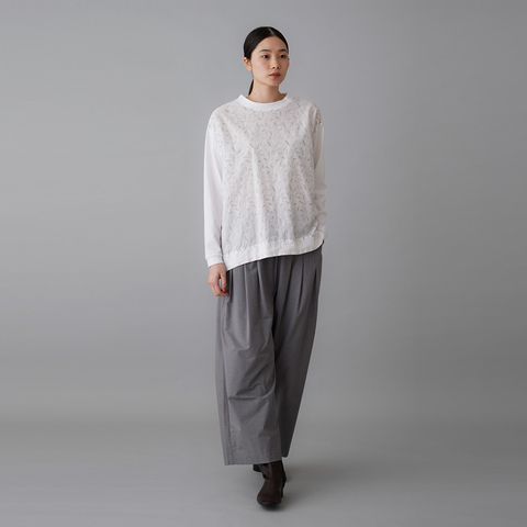 軽やかな刺繍生地と柔らかなカットソー素材の組み合わせが、上品な抜け感を演出します。