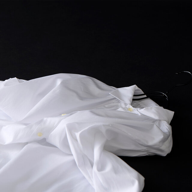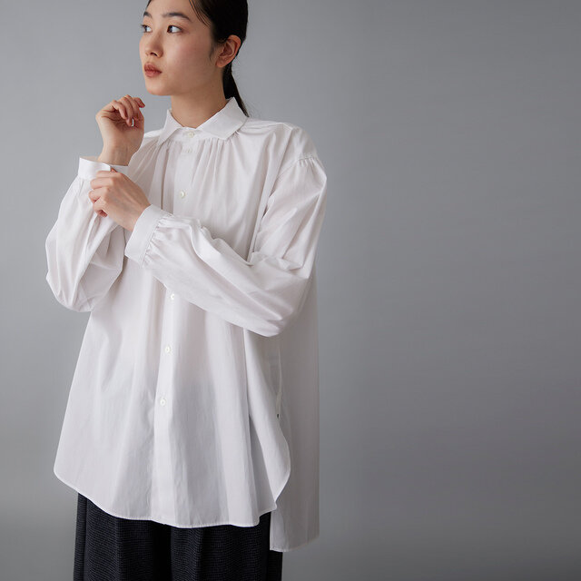 襟と繊細なギャザーが、首もとに静かな陰影と上質な表情を添えます。