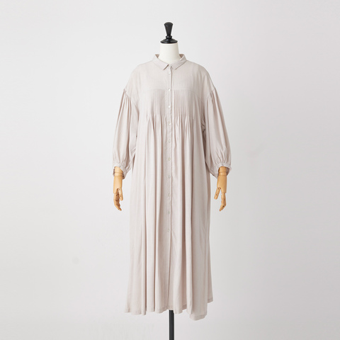 胸元からの繊細なピンタックと、背中にたっぷり寄せたギャザーが印象的な、襟付きのインド製モダールワンピース。