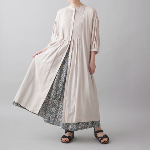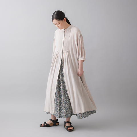 羽織るだけで雰囲気が出るロング丈で、1枚でワンピースとして着ても、パンツやスカートとのレイヤードを楽しんでも素敵です。