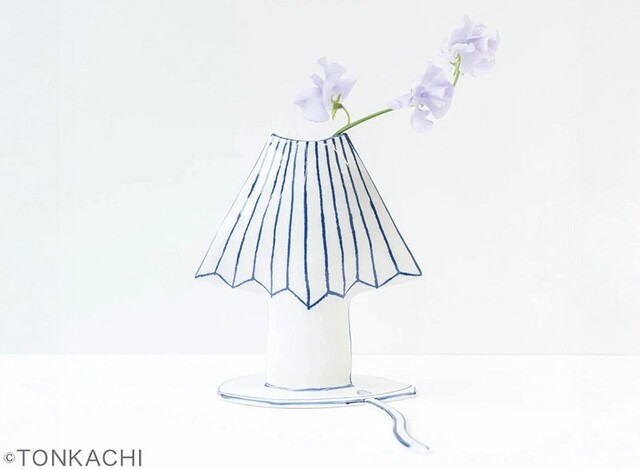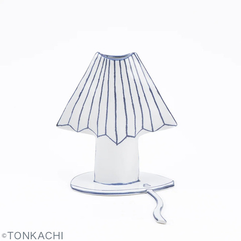 マリアンヌブルーと言われる彼女独特の青。その青のにじみと陶器の質感までもが瀬戸焼で繊細に再現されていて、まさに日本の伝統的技術あってこその完成品。マリアンヌの瀬戸焼の花瓶の中でもこれまでで一番大きなサイズで、いろんなお花が余裕で入ります。高さは21cm、ランプの上から下まで、筒状になっていますので、背の高い植物をそのまま生けても安定します。こちらの花瓶の最大のチャームポイントは、なんといっても付属のコードでしょう!厚さ5mm、全長12cmのミニミニ陶板です。この「電気のいらないコード」なしに、「ランプのかびん」は完成しません。底部分には、「Tonkachi/Made in Japan」の刻印入りです。