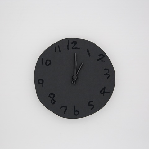 手描きした丸を文字盤にしていて、遠くからは壁の余白に黒い点を描いたように見えて、近づくとだいたいの時間が分かります。