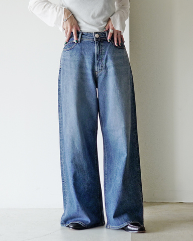 まっすぐに落ちるワイドなラインが、抜け感と女性らしさを両立させたルーズバギーデニム。